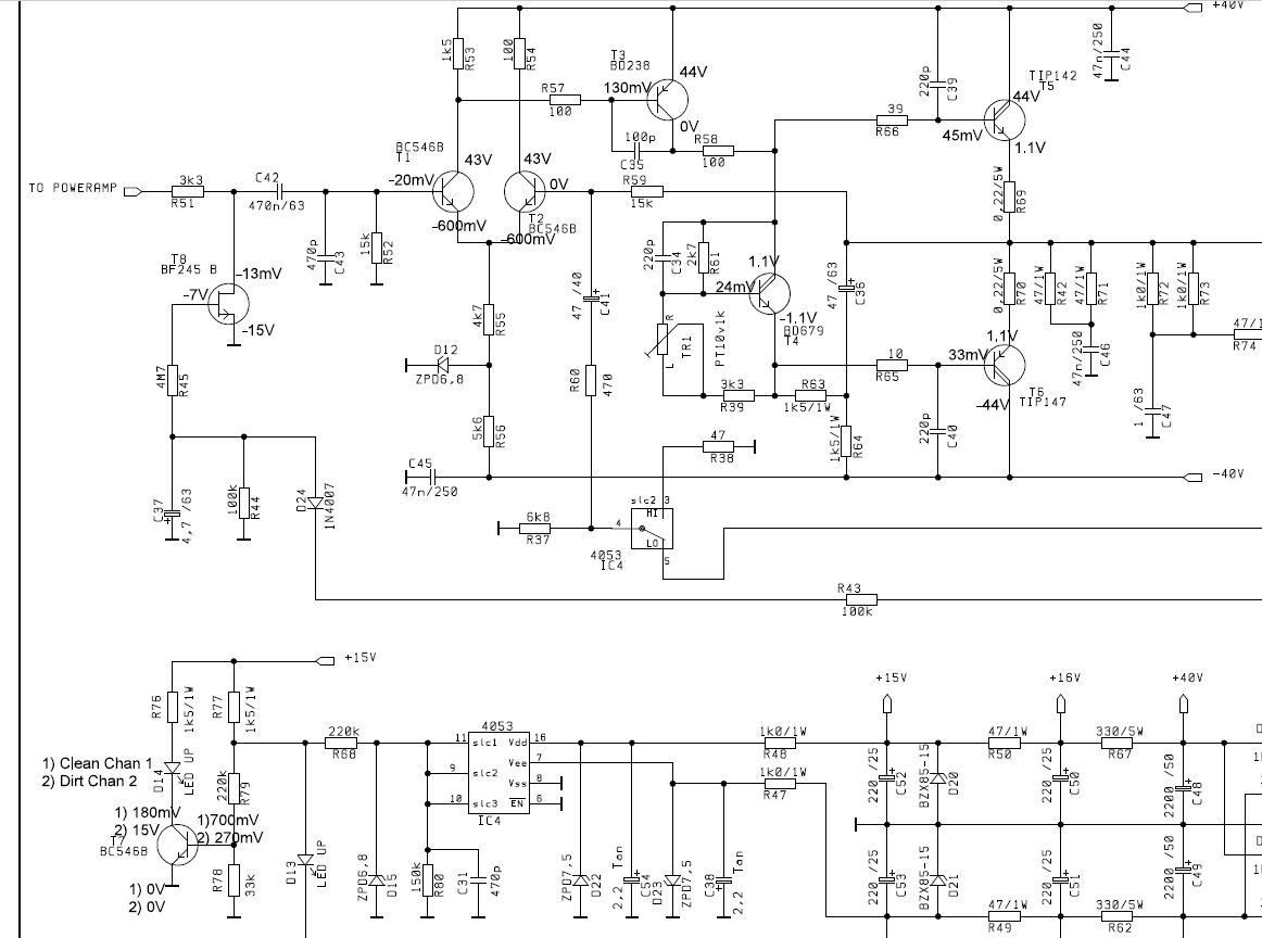 Cool, Thanks g1. I've removed the jfet T8 and now the hum has stopped but the plucking a string gives a loud sound and is then cut off almost immediately. It's the same on both channels, if I do it on channel 2 and give the low E a pluck it is deafening and then instantly cuts off to a lower level of sound.