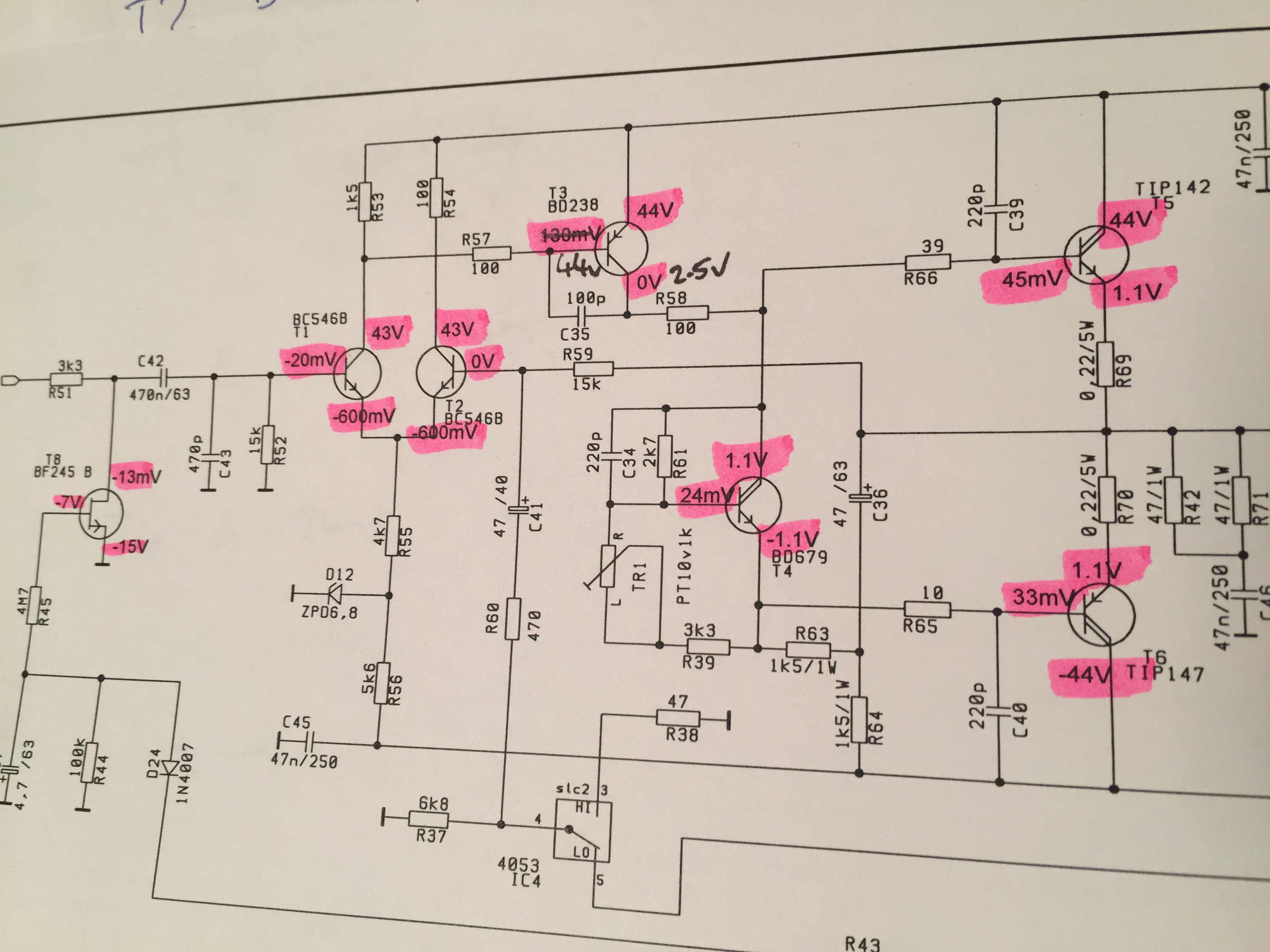 The measurements with the amp on are consistent with the above post apart from the  emitter on T6 should have been -1.1v (you're spot on), with the amp off E>B drop of each is 1.1v